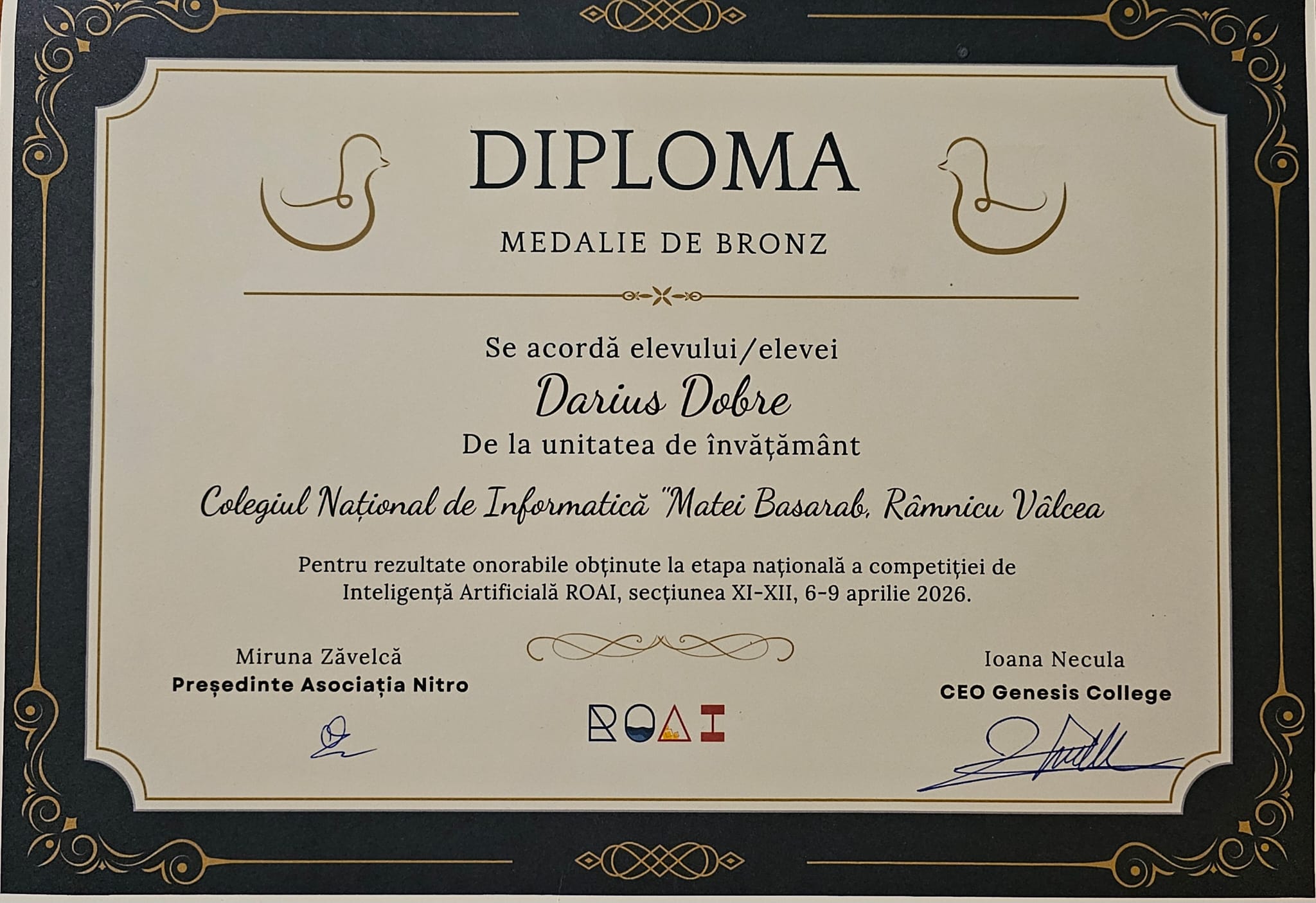 - Medalie de Bronz la ROAI: Tânărul vâlcean a obținut medalia de bronz la etapa națională a concursului de selecție pentru lotul internațional de Inteligență Artificială (ROAI).