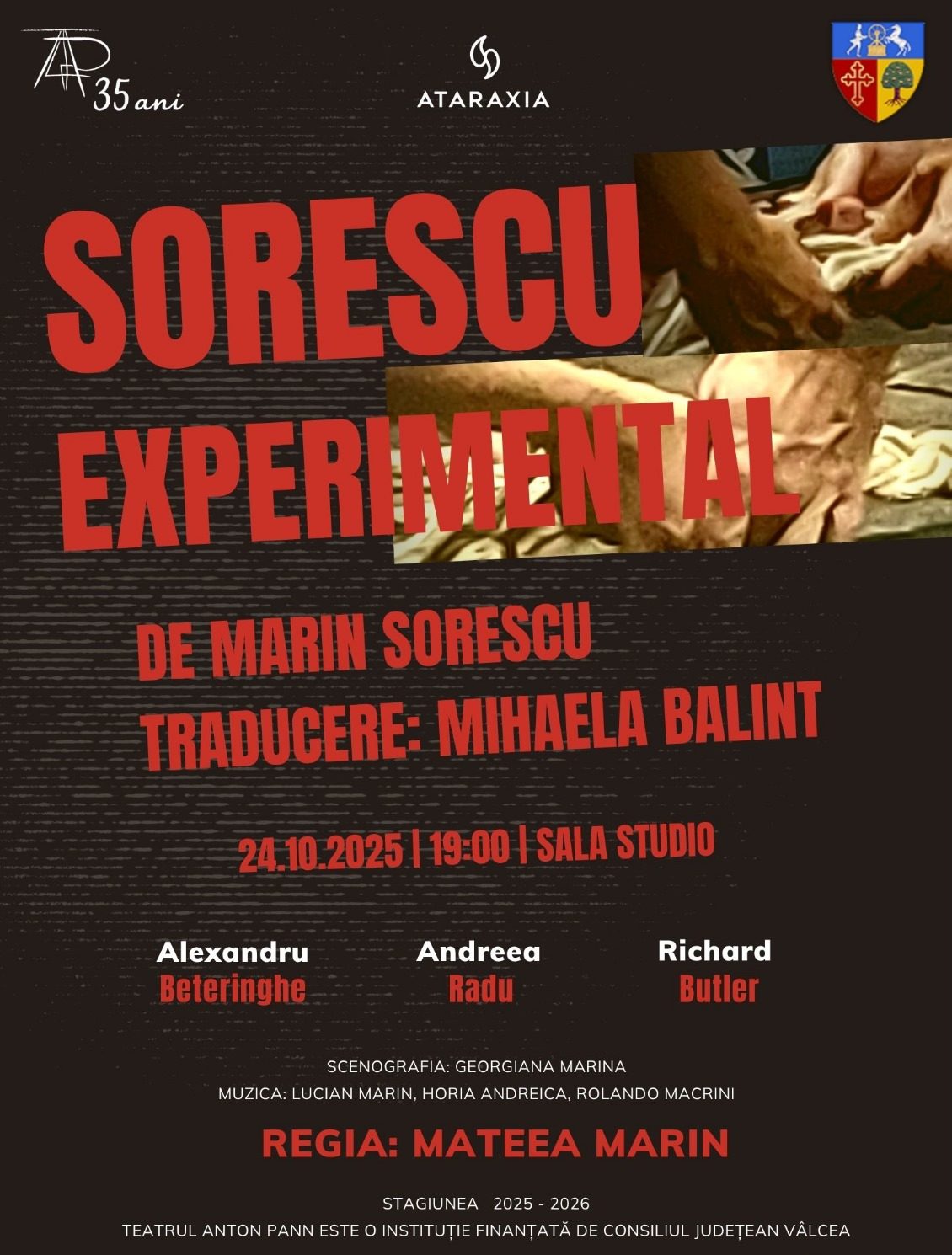Așadar, vineri 24, octombrie, de la ora 19.00, Teatrul Anton Ppann vă învită să vedeți „Sorescu. Experimental”, nu doar un spectacol, ci o hartă interioară: omul între singurătate, credință și naștere . Măcar o dată, să i se dea universul de pomană – cum ar spune Sorescu.