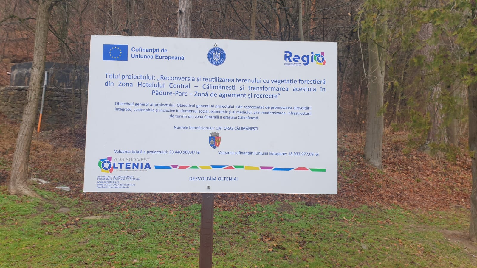 Proiectul “Reconversia și reutilizarea terenului cu vegetație forestieră din Zona Hotelului Central – Călimănești și transformarea acestuia în Pădure-Parc – Zonă de agrement și recreere” este implementat prin Programul Regional Sud-Vest Oltenia 2021-2027, PRIORITATEA: P7. Dezvoltare teritoriala sustenabila, OBIECTIV SPECIFIC: RSO5.1_Promovarea dezvoltării integrate și incluzive în domeniul social, economic și al mediului, precum și a culturii, a patrimoniului natural, a turismului durabil și a securității în zonele urbane. Contractul de finanțare a fost semnat în data de 19 noiembrie 2024 și are o valoare totală de 23.440.909,47 lei.